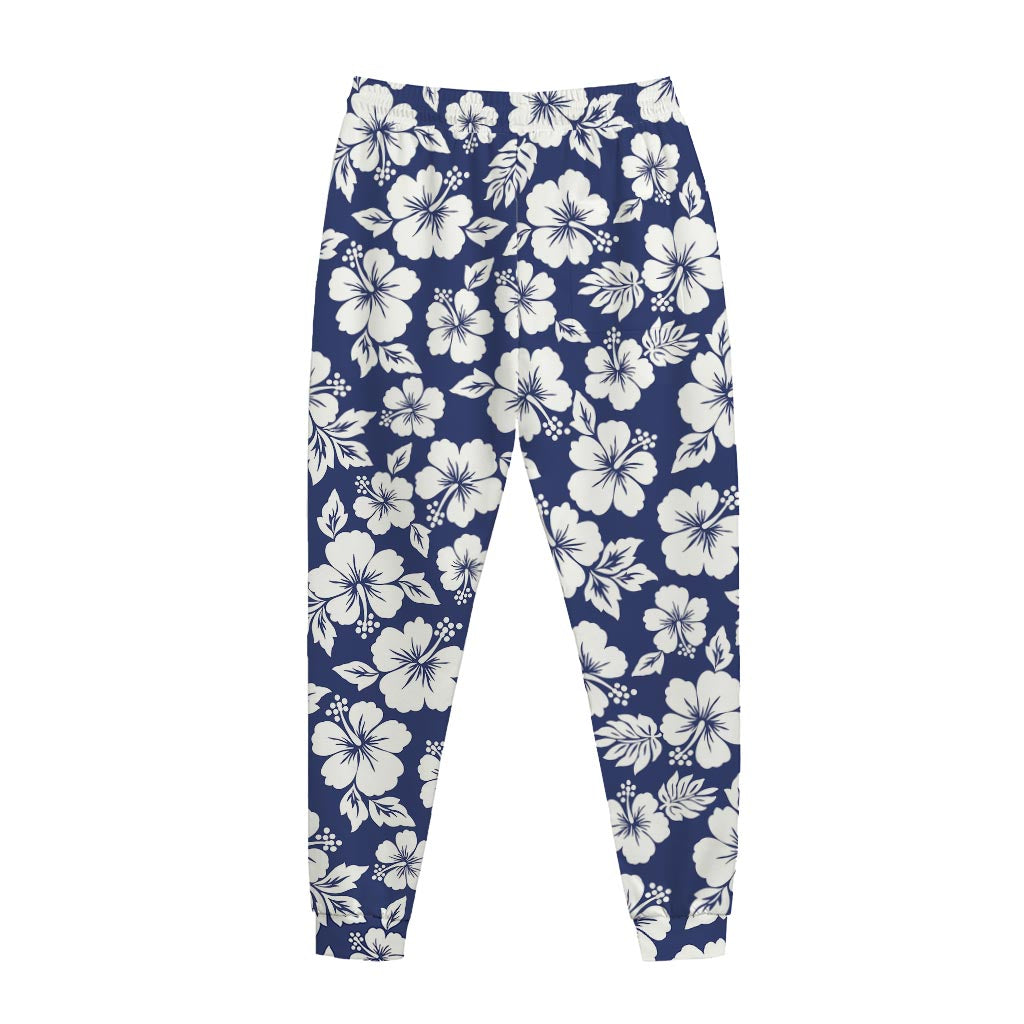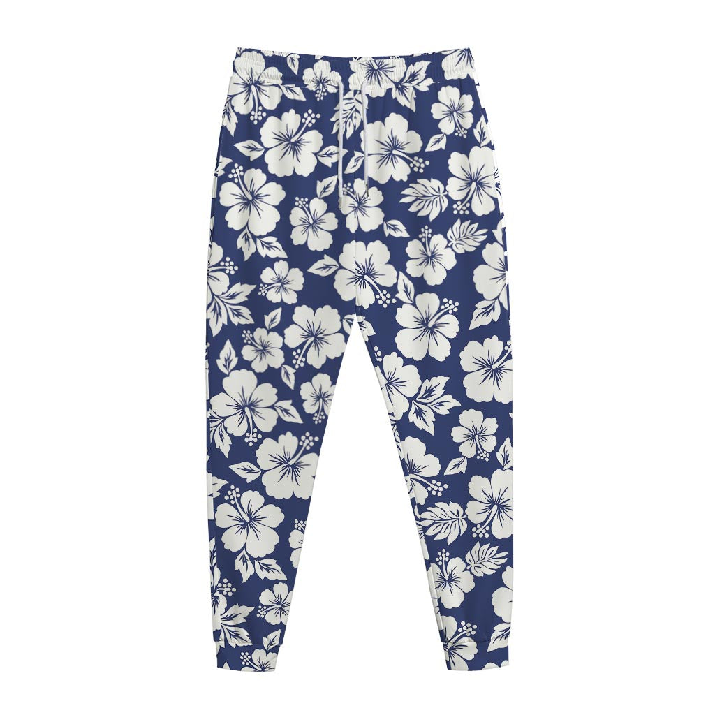 White Blue Hibiscus Floral Pattern Print Jogger Pants